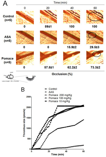 Antithrombotic therapy allows a reduction in deaths from heart attacks, the risk of stroke in people with heart irregularities (atrial fibrillation) and mini-strokes [25]. The dramatically inhibitory effects of pomace extract on platelet aggregation, induced by ADP, collagen, AA and TRAP-6 supported the assessment of pomace extract effectiveness to inhibit in vivo thrombus formation. To examine the in vivo antithrombotic activity of pomace extract, we evaluated the effects of pomace extract on laser-injured thrombus formation in mice mesenteric artery in vivo. As shown in Figure 2, in untreated mice (control), the mesenteric artery was totally blocked by a stable bulky thrombus at 20 min. In contrast, further analysis revealed that the time to form the artery thrombosis was prolonged by pomace extract-treated mice compared to the mice receiving the same volume of vehicle. Thus, one intraperitoneally bolus injection of pomace extract (200 mg/kg) 30 min before laser injury prevented thrombus formation over 60 min after laser injury, only achieving a maximum of occlusion of 73.3 ± 2% (p < 0.01 vs. control) (Figure 2).