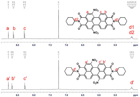 It is noteworthy that the characteristic signals of the regioisomers 1,6-A and 1,7-A in the 1H-NMR spectra (Figure 1), a singlet and two doublets of the perylene core protons, exhibit very small chemical shift value differences (0.01 and 0.04 ppm for the doublets at 8.26–8.68). However, a convenient unequivocal assignment of the NMR spectrum to the individual regioisomers 1,6-A and 1,7-A was performed on the basis of the signal of the cyclohexyl methine protons next to the imide nitrogen at 5.01 ppm. Because they are in the same chemical environment, both cyclohexyl methine protons of major regioisomer 1,7-A appear as one common multiplet at 5.01 ppm, but the signal splits into double multiplets for minor regioisomer 1,6-A (protons d1 and d2). Therefore, an unambiguous characterization has been made successfully on the basis of 500 MHz 1H-NMR.
