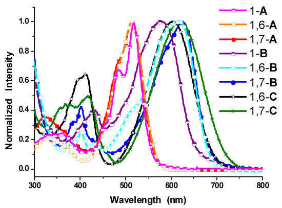 Normalized absorption spectra of 1-A, 1,6-A, 1,7-A, 1-B, 1,6-B, 1,7-B, 1,6-C, and 1,7-C in dichloromethane [53].