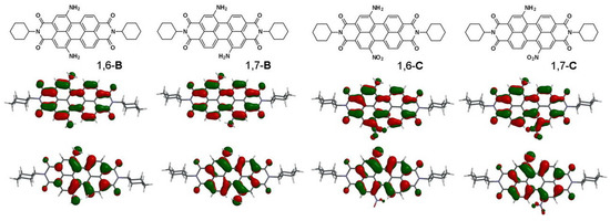 Computed frontier orbitals of 1,6-B, 1,7-B, 1,6-C, and 1,7-C. The upper graphs are the LUMOs and the lower ones are the HOMOs [53].