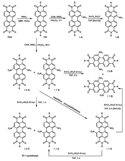 To date, a general strategy for introducing substituents onto the PBIs core is bromination of perylene dianhydride. Subsequently, nucleophilic substitutions and metal-catalyzed cross-coupling reactions can then be performed and yield a regioisomeric mixture of 1,7- (major) and 1,6-disubstituted (minor) PBIs. However, only a few reports of isolation and characterization of both 1,6- and 1,7-disubstituted PBIs have been reported, and still very little is known about the spectroscopic properties of 1,6-disubstituted PBIs [43,46,63]. To expand the scope of PBI-based chromophores available for designing systems for colorful dyes and charge transport, we have recently [53] synthesized a series of symmetric 1,7-dinitro- and 1,7-diaminoperylene bisimides (1,7-A and 1,7-B, Scheme 1). Herein, we present our research for the synthesis, separation, characterization, optical properties, and complementary time-dependent density functional theory (TD-DFT) calculations of 1,6- and 1,7-regioisomers of asymmetric and symmetric PBIs.