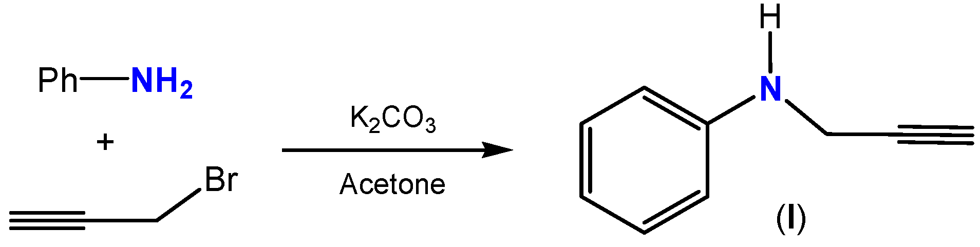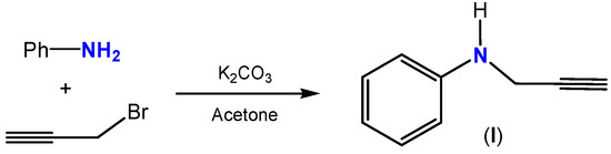 The initial synthetic step involved the preparation of N-(prop-2-ynyl)benzenamine (I) by deprotonation of aniline with potassium carbonate in acetone at room temperature, followed by the addition of equimolar amounts of propargyl bromide. After work up and purification through column chromatography on silica gel, alkyne I was isolated in 79% yield according to Scheme 1 [53].