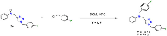 3.4. Reaction of N-((1-(4-Iodobenzyl)-1H-1,2,3-triazol-4-yl-)methyl)benzenamine (2e) with p-Halogenated Benzyl Chlorides