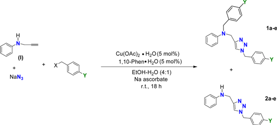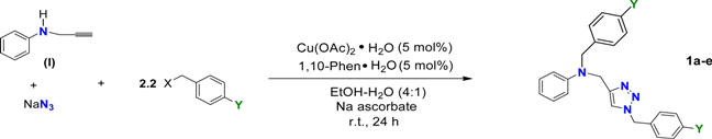 Reagents and conditions: Compound I (1.14 mmol), Cu(OAc)2·H2O (5 mol%), 1,10-phenanthroline (5 mol%), sodium ascorbate (1.14 mmol), sodium azide (1.40 mmol), p-substituted benzyl halogenide (1.40 mmol), stirring at room temperature for 18 h in EtOH/H2O (4:1).