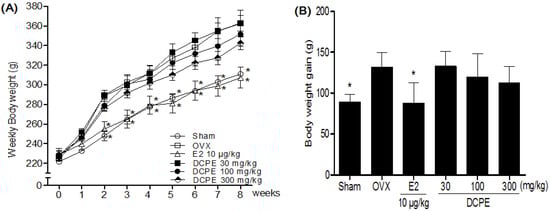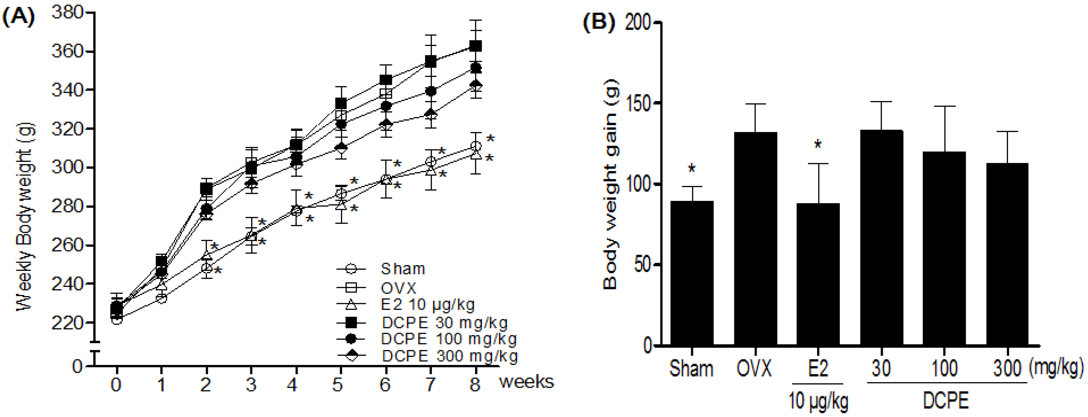 2.2. Effect of DCPE on Body Weight and Serum Lipid Concentrations in OVX Rats