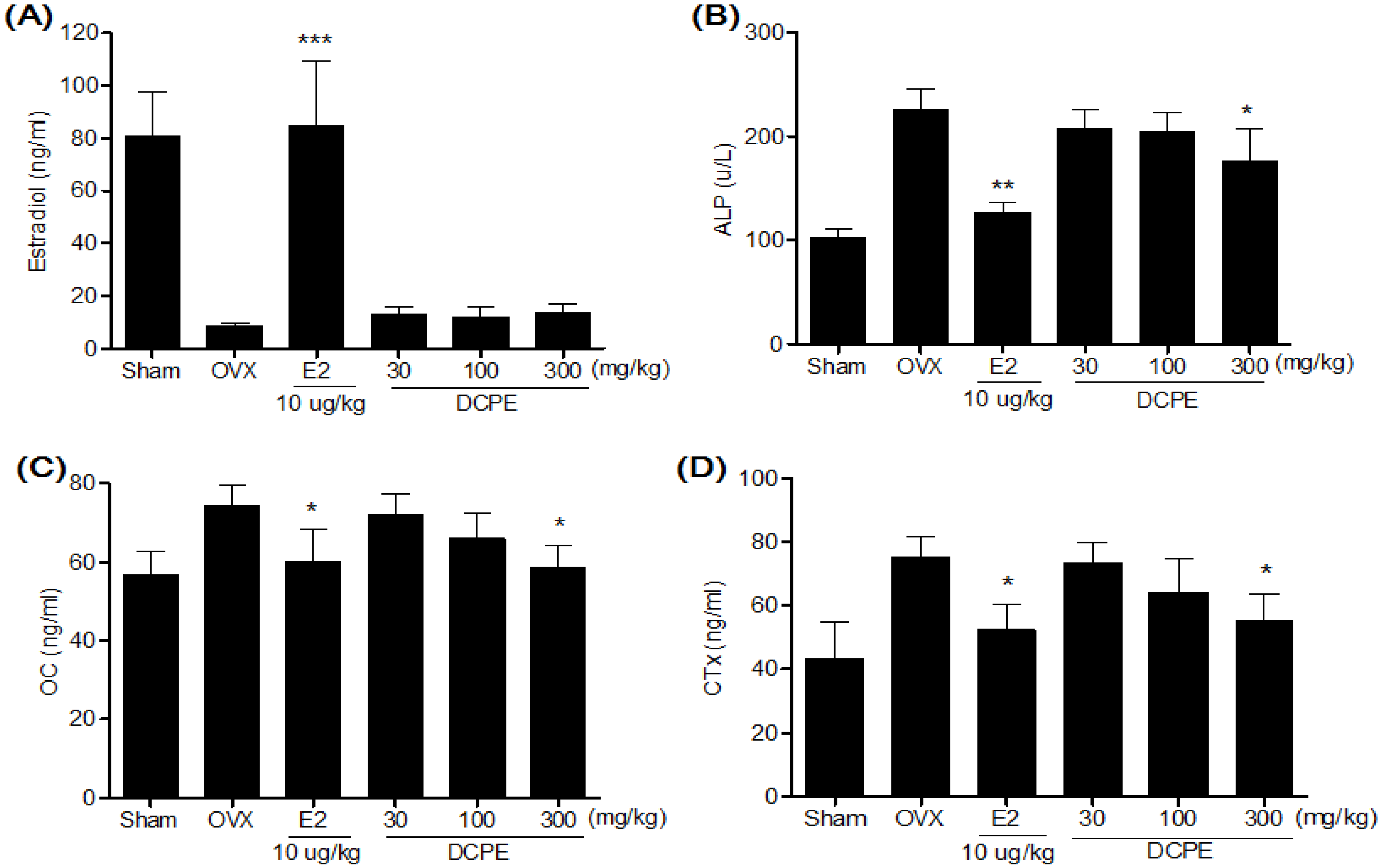 2.5. Effect of DCPE on Bone Marker in OVX Rats