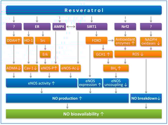 At least part of the cardiovascular effects of resveratrol are mediated by endothelial NO. Indeed, resveratrol enhances NO production through multiple mechanisms and prevents NO breakdown by reducing oxidative stress (Figure 1).