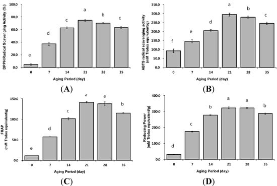 Antioxidant activities of black garlic during the aging period. (A) DPPH radical scavenging; (B) ABTS radical scavenging; (C) Fe(III) reducing (pH 3.6); (D) Fe(III) reducing (pH 6.6). Different letters above the bars for the same aging periods indicate significant difference at p < 0.05 (Duncan’s test).