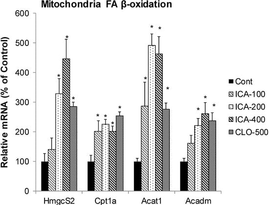 Figure 3 shows the effects of icariin and CLO on FA mitochondria β-oxidation, including Cpt1a (carnitine palmitoyltransferase 1a, rate-limiting enzyme of mitochondria FA oxidation), Acat1 (acetyl-CoA acetyltransferase 1, an enzyme central to multiple metabolic pathways), Acadm (Acad1) (Acyl-coenzyme A dehydrogenase 1, catalyzes mitochondrial fatty acid beta-oxidation), and Hmgcs2 (Mitochondrial HMG-CoA synthase, the rate-limiting enzyme in ketogenesis). CLO increased the mRNA of Cpt1a 2.8-fold, Acat1 2.5-fold, Acadm 2.4-fold, and Hmgcs2 2.9-fold. In comparison, icariin dose-dependently increased Cpt1a 4.6-fold, Acat1 2.3-fold, Acadm 2.6-fold and Hmgcs2 4.5-fold.