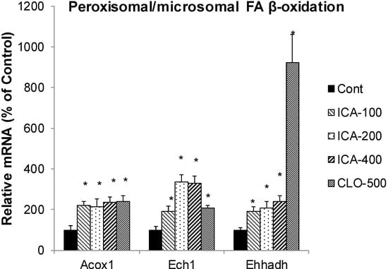 Figure 4 shows the effects of icariin and CLO on peroxisome FA oxidation, including Acox1 (acyl-CoA oxidase 1, a key enzyme involved in peroxisome β-oxidation), Ech1 (enoyl coenzyme A hydratase 1, peroxisome FA oxidation), and Ehhadh (Enoyl-CoA, 3-hydroxyacyl CoA Dehydrogenase, a proximal L-bifunctional protein). CLO increased the mRNA of Acox1 2.4-fold, Ech1 2.1-fold, but markedly increased Ehhadh 11-fold. In comparison, icariin increased Acox1 2.4-fold, Ech1 3.3-fold (in dose-dependent manner), and Ehhadh 2.4-fold.
