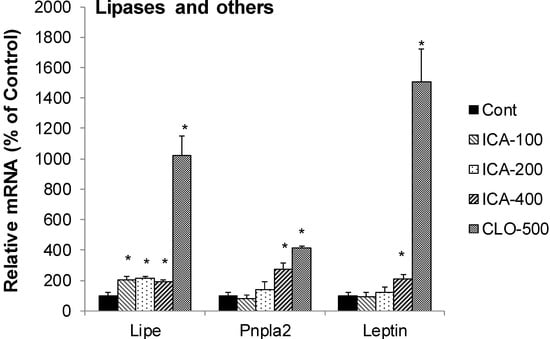 Figure 6 shows the effects of icariin and CLO on mRNAs of lipolysis enzymes, including Lipe (hormone-sensitive lipase), Pnpla2 (adipose triglyceride lipase, also known as ATGL) and Leptin. CLO increased the mRNA of Lipe 10-fold, Pnpla2 4-fold, but markedly increased the mRNA of leptin (15-fold). In comparison, icariin increased Lipe 2-fold, Pnpla2 (7-fold), and leptin (2-fold).