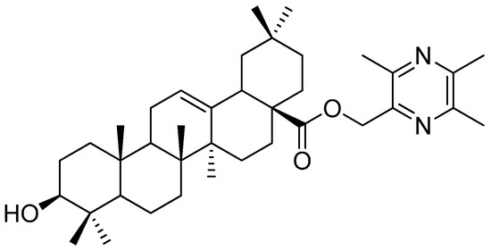 Based on the principle of chemical combination, the attempt to discover lead compounds from Traditional Chinese Medicines (TCMs) has drawn considerable attentions [1,2,3,4,5,6]. There are potential advantages in having such agents with complementary pharmacological activities in the form of a single chemical entity [2]. In the earlier studies in this field, several ligustrazine derivatives had been designed, synthesized and biologically evaluated [3,4,5,6]. Thereafter, a novel anticancer lead compound 3β-hydroxyolea-12-en-28-oic acid-3,5,6-trimethylpyrazin-2-methyl ester (TOA, C38H58O3N2, Figure 1) was screened [6,7,8,9,10,11]. TOA was synthesized by conjugating the effective antitumor ingredients ligustrazine (TMP) and oleanolic acid (OA). It exhibited promising anticancer effects in vitro [6] and prevented the expression of nuclear transcription factor NF-κB/p65 and COX-2 in S180 mice [7]. In addition, the acute toxicity tests verified that the LD50 value of TOA exceeded 6.0 g/kg via gavage in mice. However, the shortcoming of TOA’s poor hydrophilicity limited its oral bioavailability. In our previous study, solid dispersions and microemulsion systems of TOA were developed to enhance the bioactivity of TOA, and they displayed favorable pharmacokinetic profiles in vivo. The TOA microemulsion formulation showed 28-fold and 4-fold higher maximum concentration (Cmax) than the pure drug and solid dispersion, respectively [10,11].