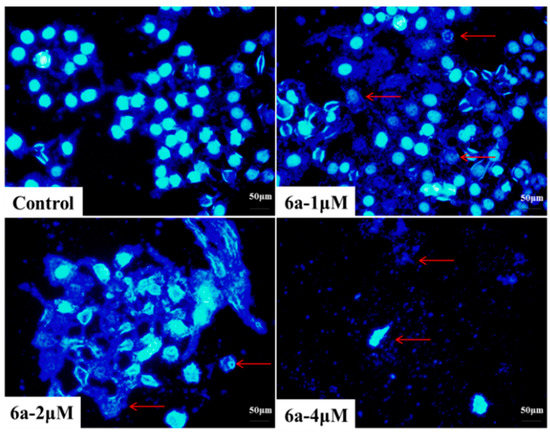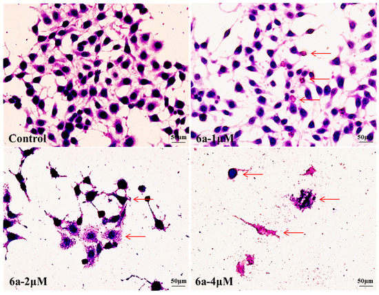 To confirm the apoptopic morphological changes induced by 6a, HepG2 cells were treated with 0, 1, 2 and 4 μM of 6a for 72 h and then Giemsa staining was performed. The morphology changes observed in treated cells compared to control cells under inverted phase-contrast microscope at a magnification of 400×, included loss of intercellular contacts, lysis of nuclei, increased cell debris and membrane damage (marked by arrows in Figure 2). Meanwhile, we could clearly observe that the morphological changes of HepG2 cells significantly increased with increasing concentration of 6a. There was no complete cell morphology when cells were treated with 2 and 4 μM of 6a.