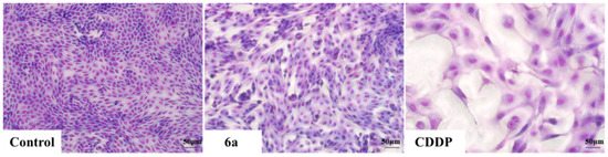 To test the agents’ nephrotoxicity, MDCK cells were exposed to 2 μM of compound 6a and CDDP for 72 h. Then Giemsa staining was performed on model cells. Changes were observed in the CDDP- treated groups under inverted phase-contrast microscope at a magnification of 200×, including less density, larger volume, lighter nuclear staining and cellular atypia. However, no significant morphological changes were observed in cells treated with 6a and control cells (Figure 3). By combining Giemsa staining, we found that 6a could induce HepG2 apoptosis and had lower nephrotoxicity than CDDP.