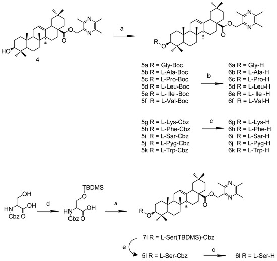 To avoid the formation of by-products, the amino acid groups were protected with t-butyloxy- carbonyl (Boc-) or benzoyloxycarbonyl groups (Cbz-). The general synthesis of compounds 6a–6l was conducted according to Scheme 2. Ester condensation reactions were catalyzed by 1-(3-dimethylaminopropyl)-3-ethylcarbodiimide hydrochloride (EDCI) and 4-dimethylaminopyridine (DMAP). The removal of the Boc- groups was conducted in 3 M HCl/ethyl acetate solution, and Cbz- groups were de-protected with H2, Pd/C (or Pd(OH)2/C). Before esterification with TOA, the hydroxyl group of Cbz-L-serine was protected with TBDMS-Cl; the TBDMS group of the intermediate was de-protected with TBAF to produce 6l. The structures of the new compounds that had not been reported previously were elucidated by HRMS and NMR spectroscopy.
