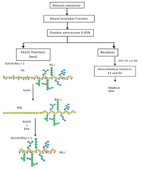 Scheme for the isolation of pectic and hemicellulosic fractions and the effects of endopolygalacturonase (EPG) and saponification by NaOH on the pectic material. Monosaccharides: galacturonic acid (GalUA), yellow; rhamnose (Rha), white; galactose (Gal), green; arabinose (Ara), blue; oxa, oxalate.