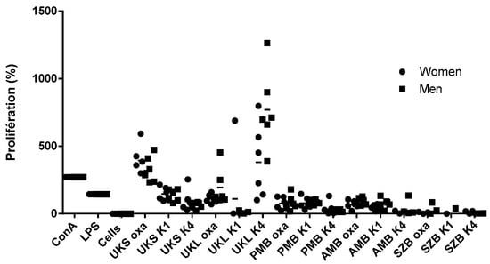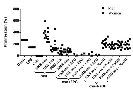 The proliferation tests carried out with the cells of the 12 volunteers (Table 2) showed different degrees of proliferation under polysaccharide stimulation and standard mitogens concanavalin A (ConA) and lipopolysaccharides (LPS). All 12 individuals had significant proliferative activity (p < 0.05) when stimulated with polysaccharides or standard mitogen (ConA and LPS) compared with the same unstimulated sample. The level of proliferation in the stimulated cells varied from 0% to 798% for females and from 0% to 1263% for males (Figure 2). The highest proliferations were observed with PBMCs stimulated with pectins from the stems and leaves of Uvaria klainei (UKSoxa, UKLoxa), and the bark of Petersianthus macrocarpus (PMBoxa) and Aphanocalyx microphyllus (AMBoxa) (Figure 2). However, the highest proliferation was also seen with PBMCs stimulated with hemicelluloses from the stems and leaves of Uvaria klainei (UKSk1, UKLk4) and hemicelluloses from the bark of Petersianthus macrocarpus (PMBk1) and Aphanocalyx microphyllus (AMBk1) (Figure 2). The variability of the response according to the stimuli suggests the diversity of the stimulating structure. The extracts from oxalate were more reactive, which is not surprising, considering that it has been shown that arabinogalactan type II (HG II) is an immunomodulator [9]. It is known that HG II comes from oxalate-digested extract. Other studies have shown the immunomodulating activity of polysaccharides [8,14,15,16]. However, this study is the first with plants endemic to Gabon, although polysaccharides from fragments rich in xylan acid extract from Fleurya aestuans (Linnaeus) in Gabon have shown increased proliferation of B-cells after stimulation with Staphylococcus aureus Cowan A [10].