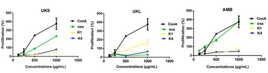 In addition to the variability of the proliferative response, the level of proliferation is also dose-dependent, as shown in Figure 3 for the pectic fractions from Uvaria klainei (UKSoxa) and Aphanocalyx microphyllus (AMBoxa) and the hemicellulosic fractions of Uvaria klainei (UKSk1) leaves. It is also clear that within the same plant, the activity varies depending on the part used.