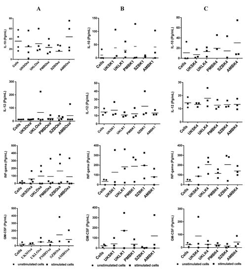 A set of PBMCs from the study’s subjects was used to measure the level of cytokine synthesis in the first step with pectin extracted from UKSoxa, UKS, UKLoxa, PMBoxa, SZBoxa and AMBoxa. The results (Figure 4A) show substantial variation at the individual level. This was observed with the synthesis of IFN-γ, which varied from 60.2 ± 73.5 pg/mL to 165.6 ± 188.7 versus 14.15 ± 13.77 pg/mL for unstimulated cells), IL-10 from 17.9 ± 12.93 pg/mL to 43.92 ± 28.1 pg/mL versus 35.58 ± 18.73 pg/mL for unstimulated cells and IL-12 from 12.65 ± 1.54 pg/mL to 65.7 ± 105.8 pg/mL versus 12.6 ± 0.56 pg/mL for unstimulated cells; then, GM-CSF from 22.5 ± 19.6 to 148.20 versus 20.67 ± 24 pg/mL for unstimulated cells. IL-6 was also elevated with the greatest amount of extract compared to unstimulated cells (7.97 to 323.63 pg/mL versus 37.54 pg/mL for unstimulated cells). However, the synthesis of IL-4 and IL-2 was not observed in vitro. Despite the differences at the individual level in the quantity of cytokine secreted by PBMCs stimulated by pectins, the difference with unstimulated cells as a group was not statistically significant (p varied between 0.38 and 1). The same experiment was conducted with PBMCs stimulated with hemicelluloses from K1 and hemicelluloses from K4. The results again show heterogeneity in the response, although the level of cytokine-like IFN-γ stimulated with SZBK1, UKLK4, PMBK4 and AMBK4 was sometimes very high (Figure 4B,C). These differences between stimulated and unstimulated cells did not reach statistical significance (197.4 pg/mL, 232.4 pg/mL, 121.9 pg/mL and 130 pg/mL, respectively, versus 49.5 pg/mL for unstimulated cells; p = 0.08 in all cases).
