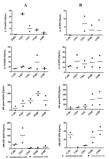 Representative dot scatter of the profile of cytokine induction by PMBCs of two volunteers after stimulation by saponified oxalate extracts (oxa + NaOH). (A) Oxalate extracts digested by EPG; (B) from plants (UKS, UKL, AMB) compared to unstimulated cells.