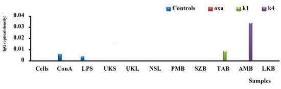 Illustration of the induction of IgG with polysaccharide extracts: oxalate (oxa), KOH 1 M (k1) and 4 M (k4) compared with concanavalin A (ConA), lipopolysaccharides (LPS) and unstimulated cells.