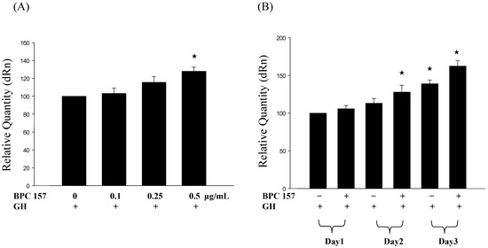 Since growth hormone receptor, after the binding of growth hormone, can trigger the activation of signal pathway and eventually lead to the increase of cell proliferation []. We, therefore, tested the effect of adding growth hormone to BPC 157-treated tendon fibroblasts. Tendon fibroblasts were treated with BPC 157 at different concentrations (0, 0.1, 0.25 and 0.5 μg/mL) for first 24 h and 0.1 μg/mL growth hormone was added for another 24 h and cell viability was determined by MTT assay. Results in Figure 2A demonstrated a dose-dependent increase of viable cells after the addition of growth hormone. Similarly, the number of viable cells after the addition of 0.1 μg/mL growth hormone to BPC 157-treated cells for one to three days significantly increased in a time-dependent manner (Figure 2B), proving that BPC 157 pretreatment could potentiate the effect of growth hormone on increasing the number of viable cells. To further demonstrate the effect of BPC 157 and growth hormone on the cell proliferation of tendon fibroblasts, we analyzed the expression of cell proliferation marker, proliferating cell nuclear antigen (PCNA) in tendon fibroblasts at the RNA expression level by RT/real-time PCR. Results in Figure 3A,B revealed a similar pattern of PCNA induction in tendon fibroblasts by BPC 157 and growth hormone that was correlated very well with the increase of viable cell number.