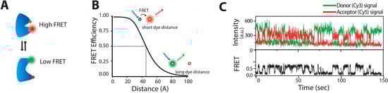 smFRET description (A) A biomolecule undergoing time dependent conformations motions changing the inter dye distance and hence the FRET readout; (B) Diagram of FRET efficiency, E, as a function of inter-dye distance (R) for a R0 = 45 Å. The donor fluorophore when excited with laser either fluoresces or transfers a part of its energy to an acceptor fluorophore, depending on their distance. At distance equal to the Förster radius R = R0, E = 0.5. FRET changes are higher at distance variations around the Förster radius; (C) Typical time trace of single molecules (here DNA molecules) undergoing conformational fluctuations between two states recorded by fluorescence microscopy. Top trace shows the anticorrelated time traces of donor (green) and acceptor (red) molecules. Bottom trace shows the corresponding EFRET. (Figure 1C adapted with permission from [47].)