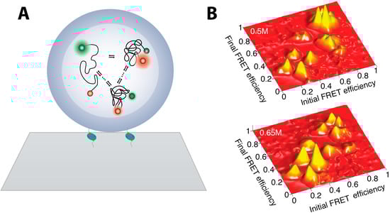 smFRET studies of adenylate kinase enzymes folding (A) Individual AK enzymes, double labeled for smFRET measurements, were encapsulated inside liposomes minimizing interaction with hard matter allowing unbiased measurements of the folding landscape. Liposomes are tethered on glass microscope surface via biotin-avidin interaction; (B) Transition density plots showing the preferred transition pathway of folding to depend on denaturant concentrations. As the denaturant concentration increases more transition between lower FRET states occur and the fraction of sequential—between states of similar FRET intensity—increases (Figure 2 is adapted from [74] with permission).