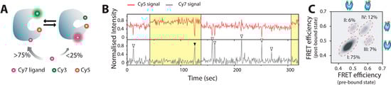 Direct and synchronous observation of protein conformational dynamics and ligand binding on an individual Maltose Binding Protein to decipher the mechanism of action. (A) Cartoon representation depicting the existing equilibrium between an open and closed state and ligand binding preferentially to the open state; (B) Three color smFRET traces depicting the binding of Cy7-maltose to an open and partially closed state of MBP as open and solid arrowheads; (C) Correlation plot of Cy3-Cy5 FRET efficiencies both at the binding and dissociation points for the binding events of single Cy7-maltose showing the relative distribution of the four possible scenarios; type I, binding to an open state and dissociation from the same state; type II, binding to an open state and dissociation from a partially closed state; type III, binding to a partially closed state and dissociation from an open state; and type IV, binding to a partially closed state followed by dissociation from the same state. (Figure 3 adapted from [102] with permission).