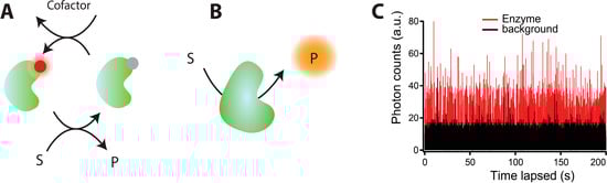 A general description of the methodology to attain single turnover resolution measurements. (A) A method exploiting fluorescence property changes within each catalytic cycle of cofactors or covalently attached fluorophores; (B) Prefluorescent substrate analogues for prolonged observation of individual catalytic turnovers. The non-fluorescent substrate is converted by the enzyme to the highly fluorescent product, which subsequently diffuses away from the detection volume allowing recordings of individual catalytic cycles. Being limited only by substrate depletion this methods allows recordings of thousands of catalytic cycles for accurate statistical analysis; (C) A typical single molecule activity trace of lipase converting a prefluorescent substrate analogue, here CFDA, to highly fluorescent carboxy-fluorescein (red trace). Each spike corresponds to an individual catalytic cycle. The black trace corresponds to the background signal (Figure 4C reprinted with permission from [17]. Copyright (2012) American Chemical Society.)