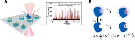 (A) First measurements of individual turnover activity on membrane spanning enzymes (POR) on prefluorescent substrate, by using Nanodiscs—nanometer scale membrane patches—to spatially confine them in native like membrane environment; (B) Schematic representation of a general two-state model that accurately describes the catalytic behavior of multiple enzymes POR, TLL, CALB, NiR (see in text). The model is an extension of the Michaelis–Menten equation and contains two interconverting functional states with respective activity rates kact1 and kact2. Adapted with permission from [16]. Copyright (2014) American Chemical Society.