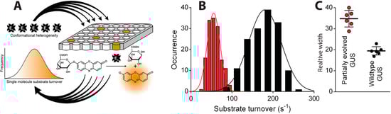 The manifestation of multiple long lived states that extend into the realm of protein lifetime are expected to have mechanistic and biological significance since evolutionary pressure is required to evolve and maintain them [163]. Indeed recent pivotal work by the group of Gorris provided the first single molecule insights on the functional diversity of evolving enzymes [164]. Using arrays of femtoliter reaction chambers they compared the activity behavior of β-glucuronidase (GUS) and partially evolved GUS variants—called generalists—that retain their wild-type activity but also exhibit promiscuous activity accepting a broad range of other substrates. Their findings revealed significantly more broad long lived activity fluctuations for the partially evolved enzymes as compared to the wild type, see Figure 6. These data provided the first links of widths of activity distributions to increased variant promiscuity supporting the notion that increased widths of activity distributions-and thus functional promiscuity may serve as evolutionary starting points for the functional adaptation of enzymes [165].
