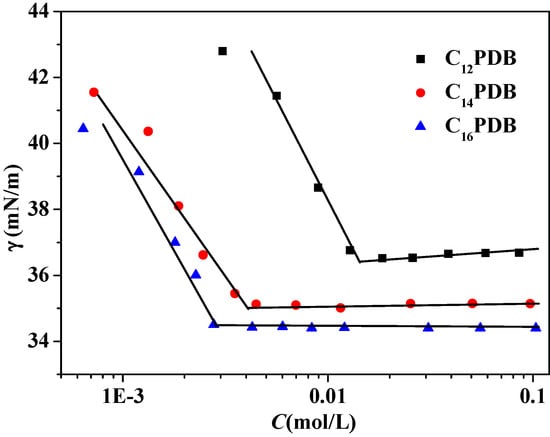 Figure 1 shows the surface tension of CnPDB (n = 12, 14, 16) in EAN at various concentrations at 298 K. The surface tension of the CnPDB solution decreases sharply at the beginning compared with pure EAN. As CnPDB concentrations increase further, the surface tension decreases gradually. Finally, the surface tension remains constant above the critical micelle concentration (cmc). The cmc values are listed in Table 1. The cmc value of a surfactant reflects its surface properties, a smaller cmc value means better surface activity. The value of cmc declines with the increase of hydrocarbon chain length, which is similar to their aggregation behavior in aqueous solution. The result suggests that there exist solvophobic interactions between the hydrocarbon chain and EAN, similar to the hydrophobic interactions in water. The obtained cmc values of CnPDB are higher than those in aqueous solution [32]. The cmc values of CnPDBs in EAN are smaller than those of CnmimBr (0.139, 0.0350 and 0.00913 mol·L−1) and CnMPB (0.097, 0.026 and 0.0078 mol·L−1) for the same alkyl chain length [45,46]. The cations of CnmimBr and CnMPB have a great impact on that. There are two main two reasons, head groups have opposing tendencies to keep close to minimize hydrocarbon-solvent contacts and to repel as a result of electrostatic repulsion, solvation and steric hindrance [51]. The reason might be the lower hydrophilicity of the CnPDB head groups than that of CnmimBr and CnMPB.