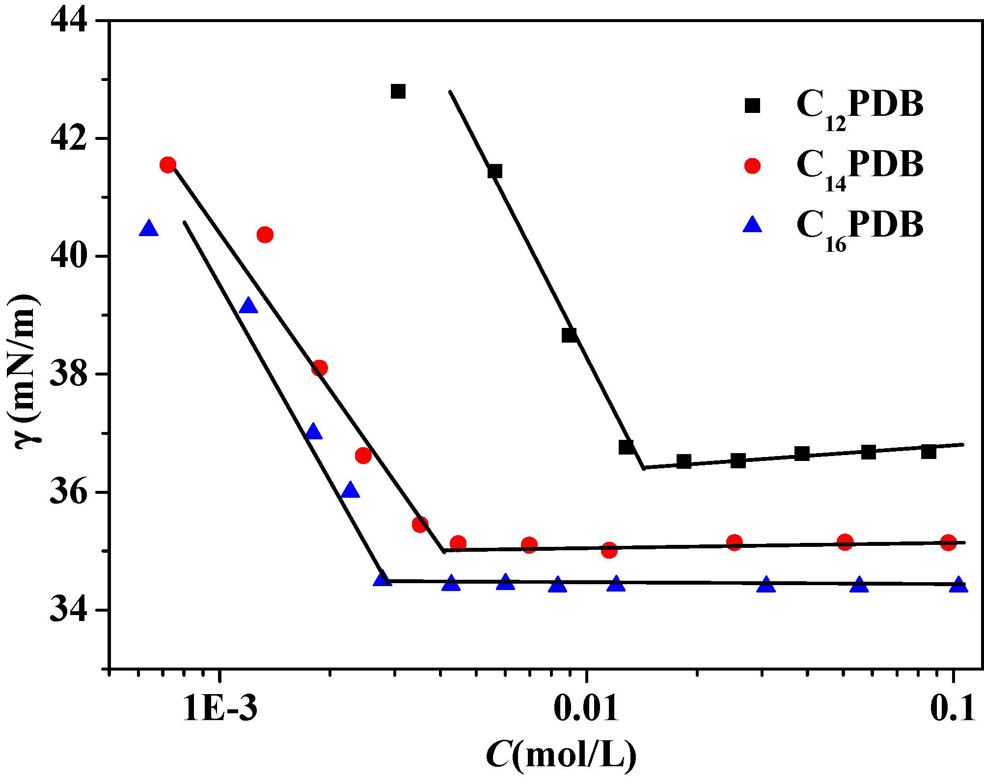 Surface tension as a function of CnPDB concentration at 298.15 K.