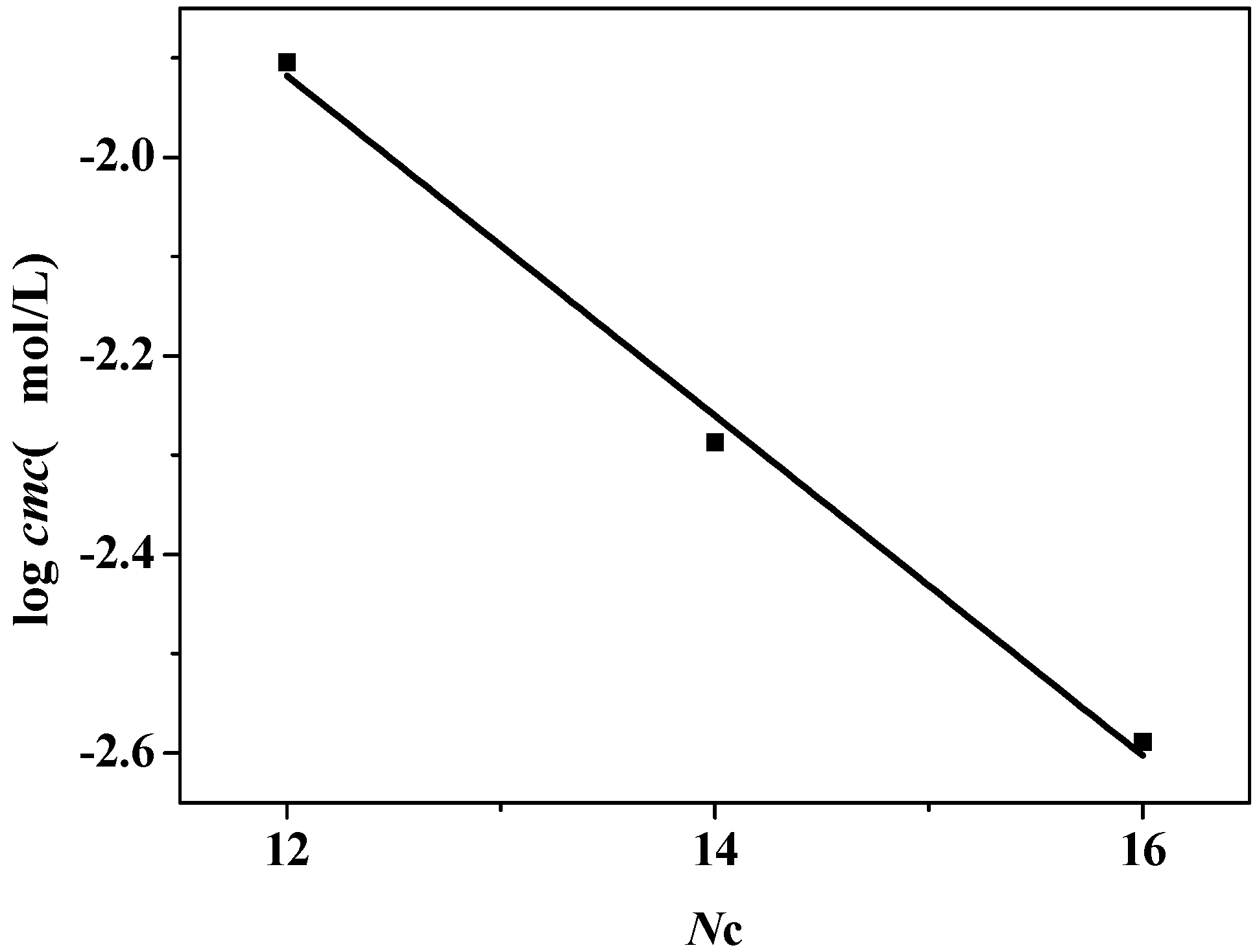 Figure 2 shows the relationship between the number of carbon atoms in the hydrocarbon chain of CnPDB and lgcmc. Figure 2 shows that lgcmc decreases with the increase of alkyl chain length and the plot is almost liner. The rule can be expressed by the empirical formula: