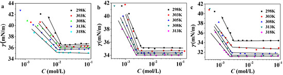 Plots of surface tensions against CnPDB concentrations at various temperatures are shown in Figure 3. The values of cmc for CnPDB at various temperatures are listed in Table 2. Figure 4 gives the correlations between cmc and temperature. It indicates that the value of cmc decreases with the temperature increase in a trend of U-shape and fits with a second-order polynomial. This trend is similar to the other ILs in EAN [46,47].