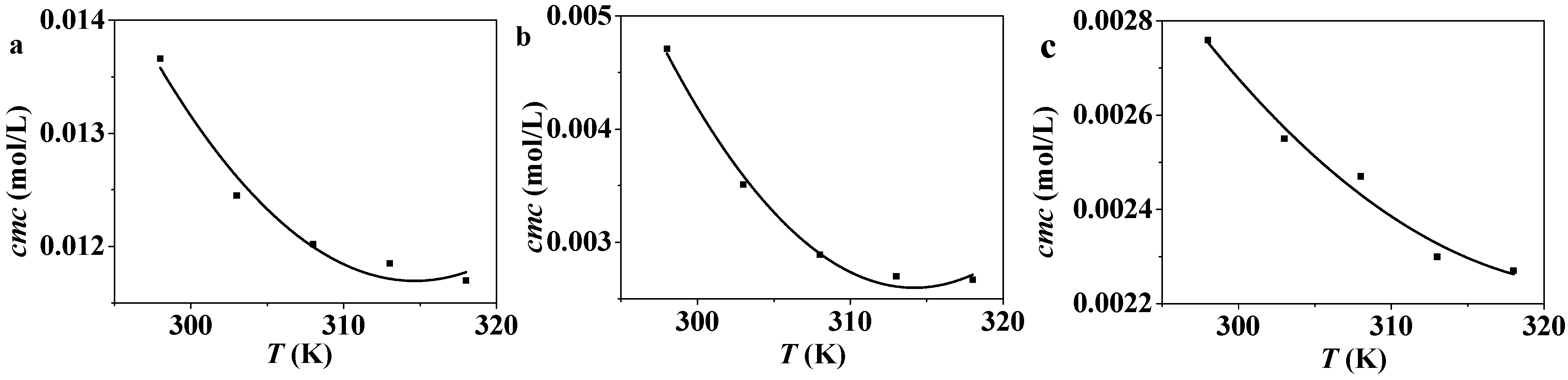 Plots of cmc versus temperature of C12MDB (a), C14MDB (b), C16MDB (c).