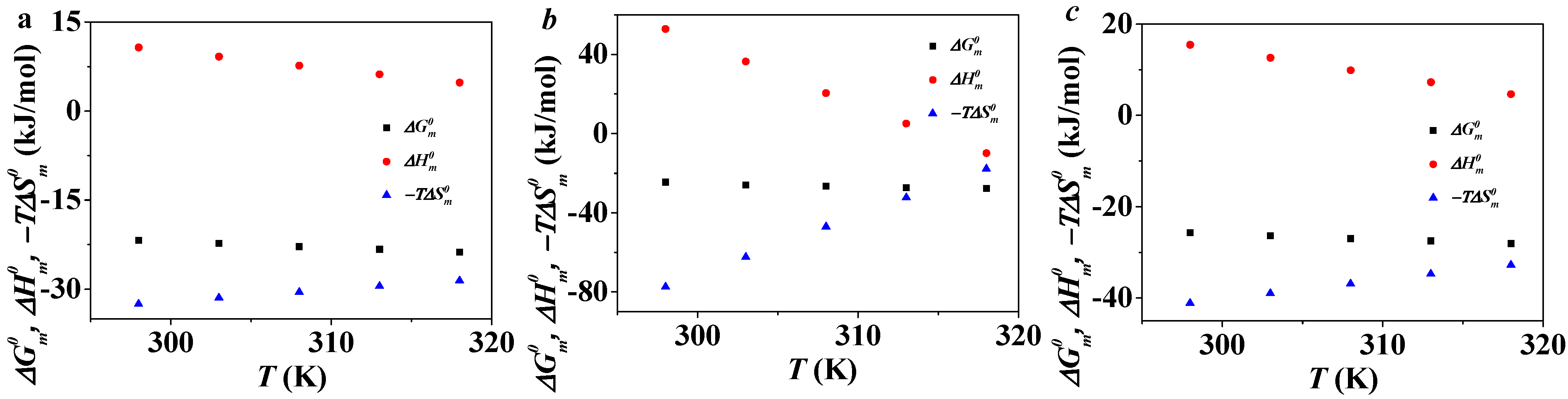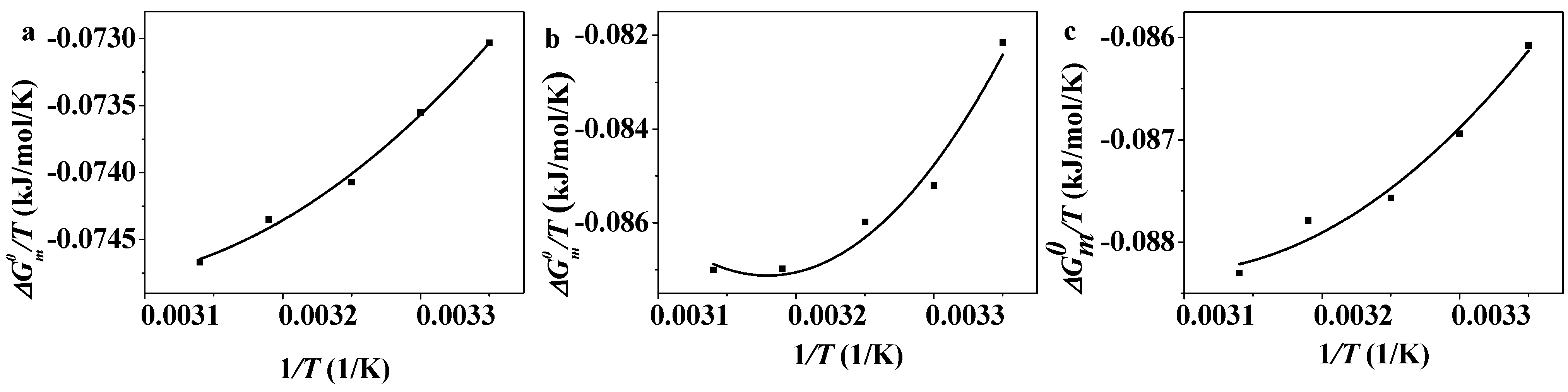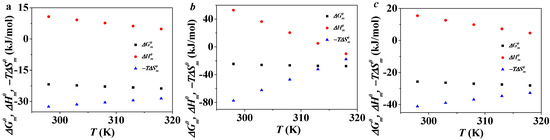 The value of at different temperatures can be calculated based on Equation (5). As is shown in Figure 5, the value of increases along with the increase of 1/T. The plot fits with a second-order polynomial and the quadratic equations can be obtained. The values of and of C12PDB, C14PDB and C16PDB at different temperatures can be calculated according to Equations (6) and (7). Figure 6 shows the plots of , and versus temperature of CnPDB (n = 12, 14, 16). is negative and decreases with the increase of temperature which is similar to the other ILs in EAN. From 298 K to 318 K, increases with the temperature while the value of decreases. The figure indicates that the negative is mainly contributed by the large negative . Thus, the micelle formation of CnPDB (n = 12, 14, 16) in EAN is an entropy-driven process.
