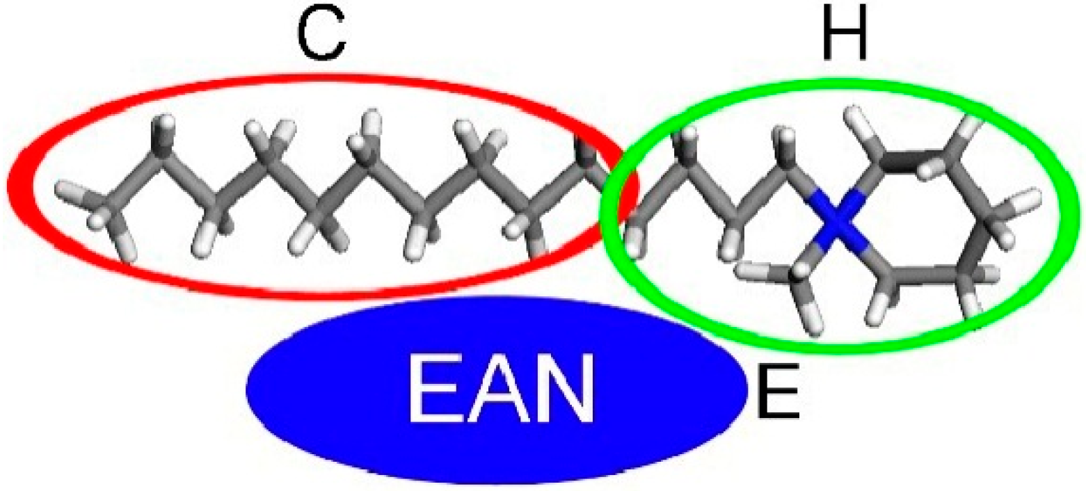 Simulation model of CnPDB in EAN. The CnPDB molecule is divided into two parts, alkyl-chain (C) and headgroup (H). Water is represented by (E).