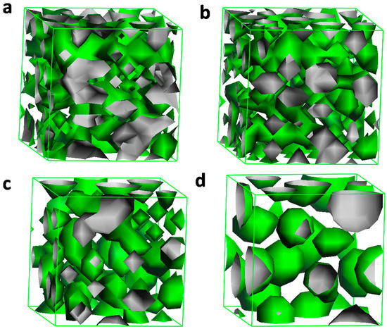 Simulation of micelle formation of 20% CnPDB in EAN at room temperature at different time steps: (a) 3; (b) 10; (c) 100; (d) 20,000. The size of the simulation model is 10 × 10 × 10 in DPD units.