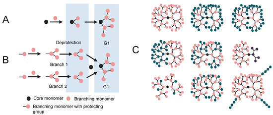 - Tomalia, D.A. Birth of a new macromolecular architecture: Dendrimers as quantized building blocks for nanoscale synthetic polymer chemistry. Prog. Polym. Sci. 2005, 30, 294–324. [Google Scholar]