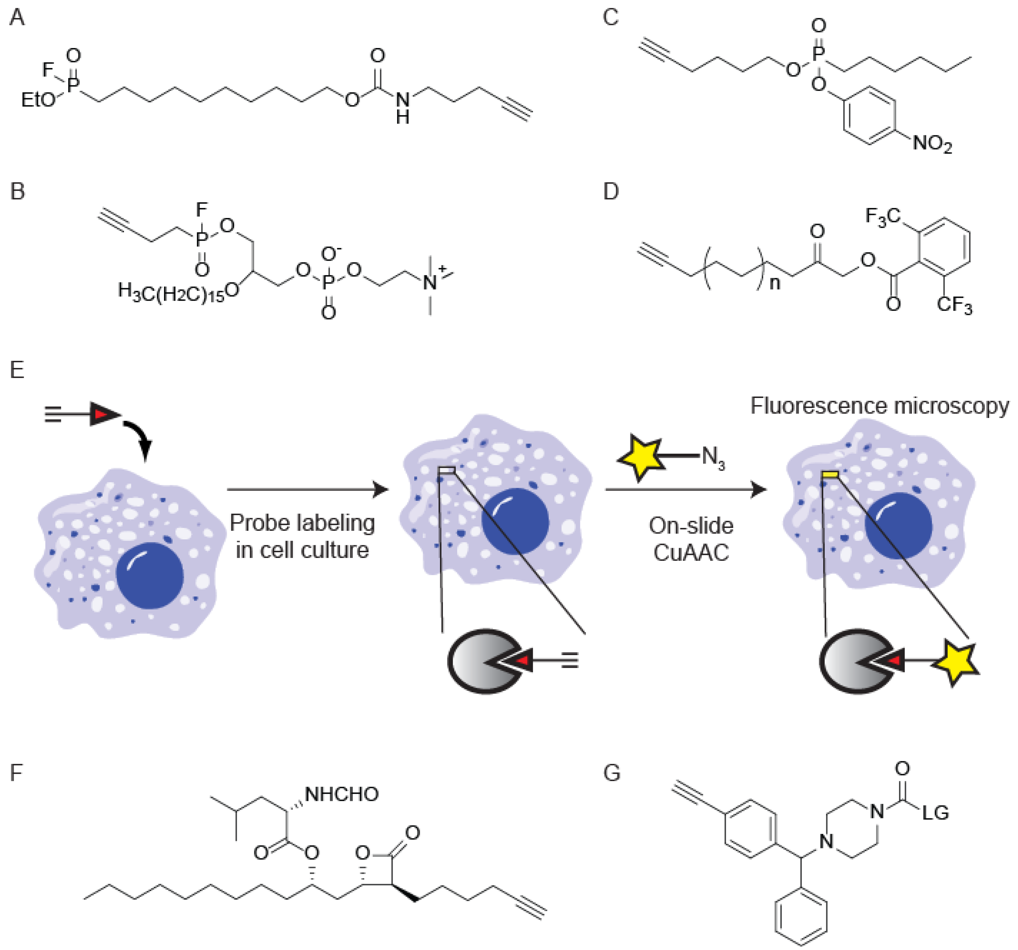 CuAAC-compatible ABPs for serine hydrolases. (A) Fluorophosphonate-alkyne (FP-≡) is a cell-permeable pan-serine hydrolase probe; (B) A phosphatidylcholine-based probe for profiling serine phospholipases; (C) A nitrophenyl-phosphonate (NP) ester-based probe for lipase profiling in cells; (D) An acyloxymethylketone (AOMK) probe for profiling lipid-associated proteins; (E) Workflow for imaging subcellular localization of active enzymes in cells using CuAAC-ABPP. Probe labeling is followed by cell fixation and addition of CuAAC reagents; (F) An Orlistat analog that labels fatty acid synthase; (G) The general scaffold for a library of carbamate-based probes for selective serine hydrolase labeling (LG = leaving group).