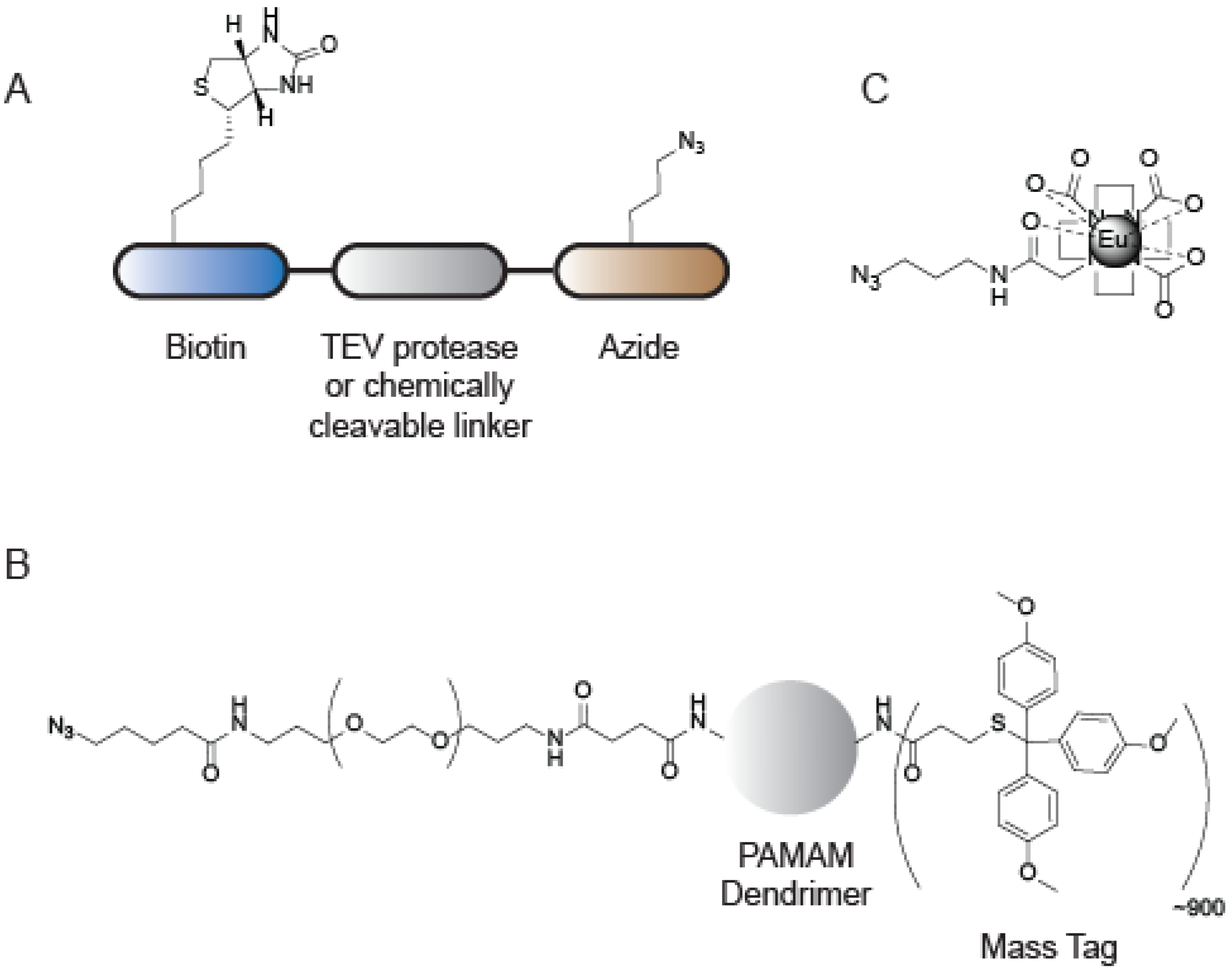 CuAAC-compatible tags for mass-spectrometry applications. (A) TEV-protease cleavable and chemically cleavable tags for identifying the site of labeling of ABPs; (B) Laser-cleavable mass tag for imaging mass spectrometry to identify the localization of active enzymes in cells and tissues; (C) Eu-labeled tag for ICP-MS based absolute quantification of active enzymes from a mixture.