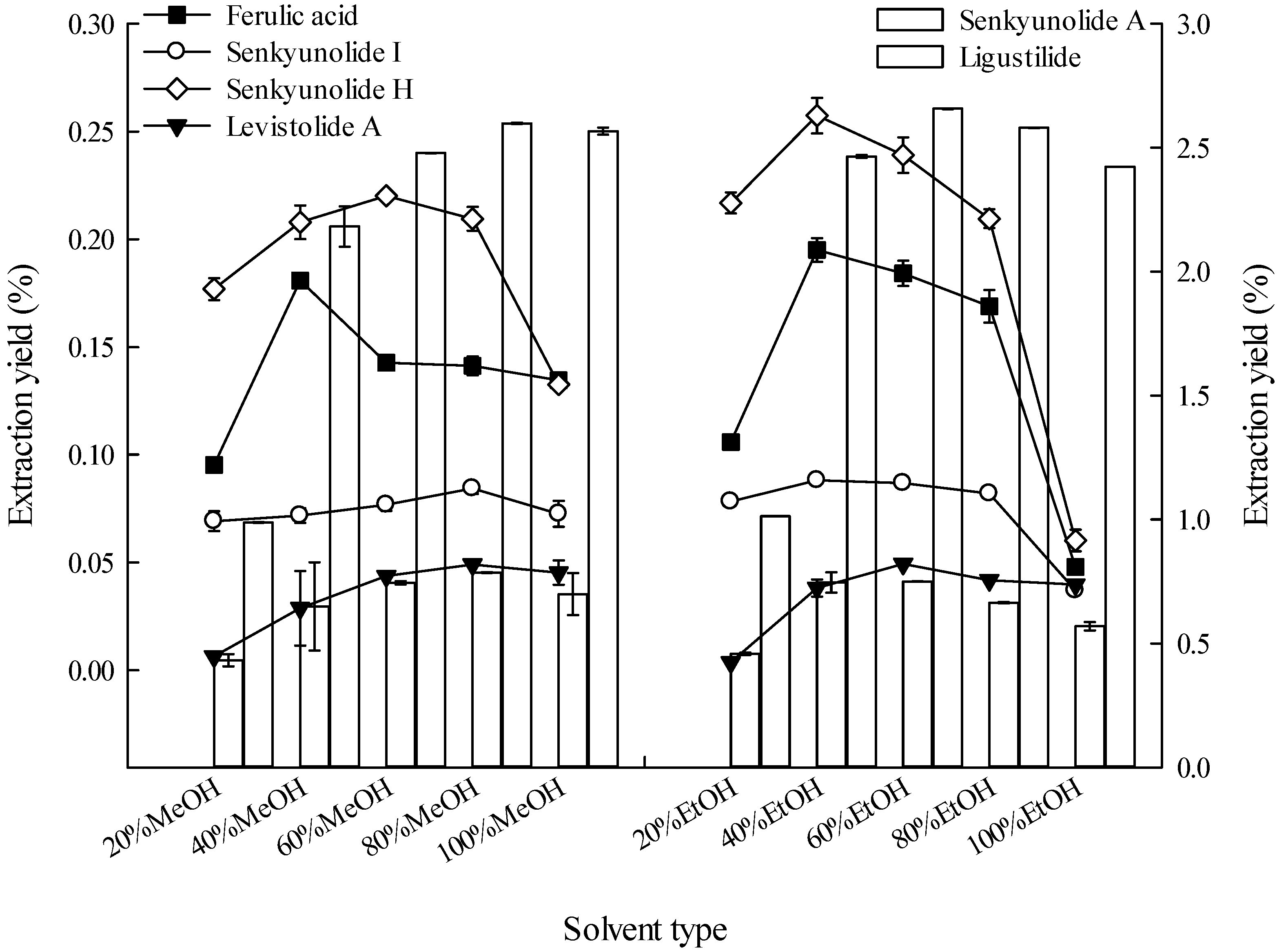 Solvent selection is important in the extraction of compounds from botanical materials [30]. Figure 1 shows that under similar extraction conditions 40% EtOH is superior to other solvents in extracting ferulic acid and senkyunolide H from L. chuanxiong rhizome. Both 40% EtOH and 60% EtOH are superior to the other solvents in extracting senkyunolide I, but without significant differences in their extraction yields (analysis of variance, p ≤ 0.05, the same below). Additionally, 80% MeOH and 60% EtOH are superior to other solvents in extracting levistolide A, but not significantly different from 40% EtOH. Moreover, 80% MeOH and 40% EtOH are superior to other solvents in extracting senkyunolide A, but without significant differences. The 60% EtOH solvent is superior to other solvents in extracting ligustilide and does not significantly differ from 40% EtOH.