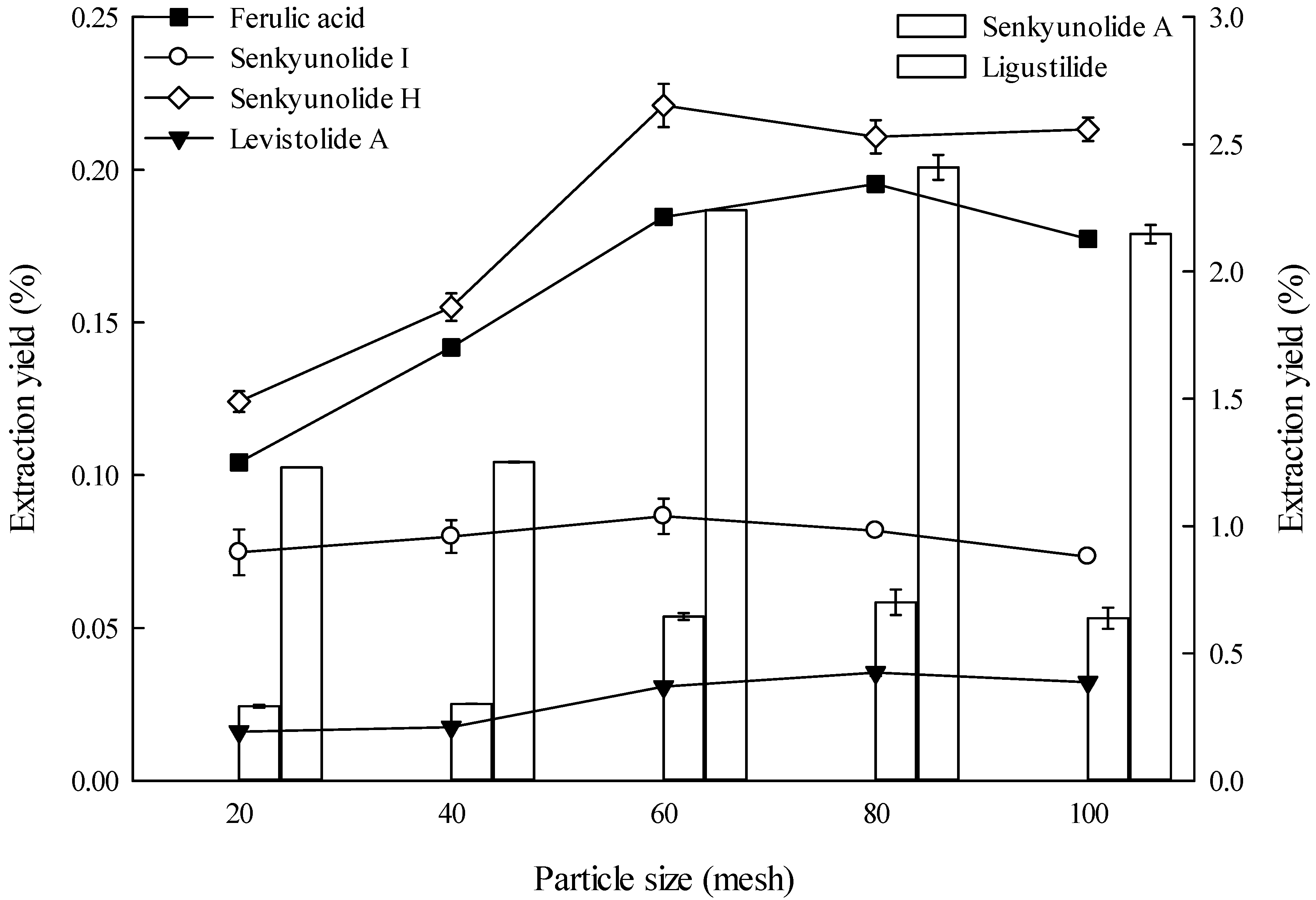The appropriate particle size is fundamental to obtain optimal extraction, and varied particle sizes could significantly affect the extraction yield. In this study, 80 mesh was better than other particle sizes in extracting ferulic acid, levistolide A, senkyunolide A, and ligustilide (Figure 3), whereas 60 mesh was better than other particle sizes in extracting senkyunolide I and senkyunolide H. These two mesh sizes do not differ significantly.