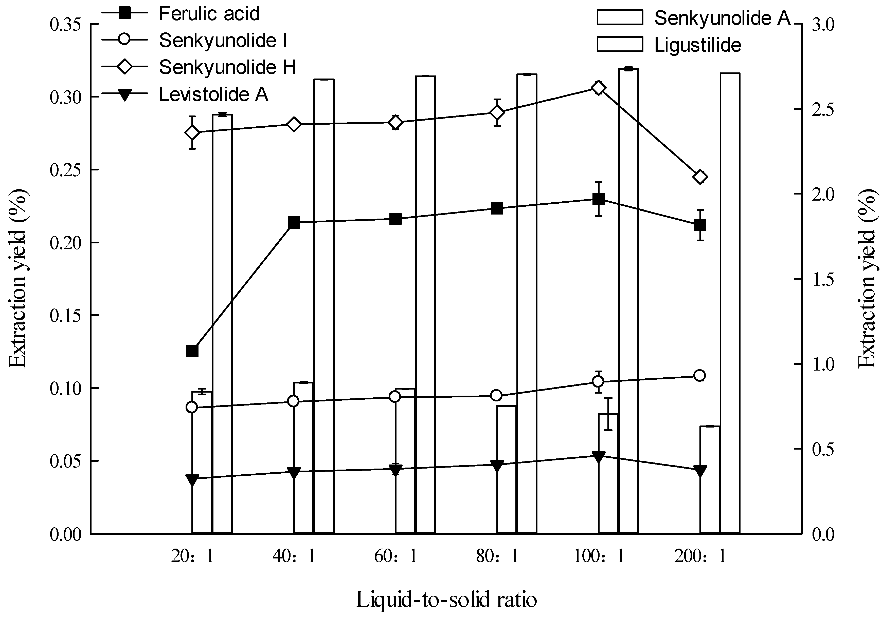 Effects of liquid-to-solid ratio on the extraction yields of the six constituents (the lines and bar graphs are referenced to the left and right axes, respectively).