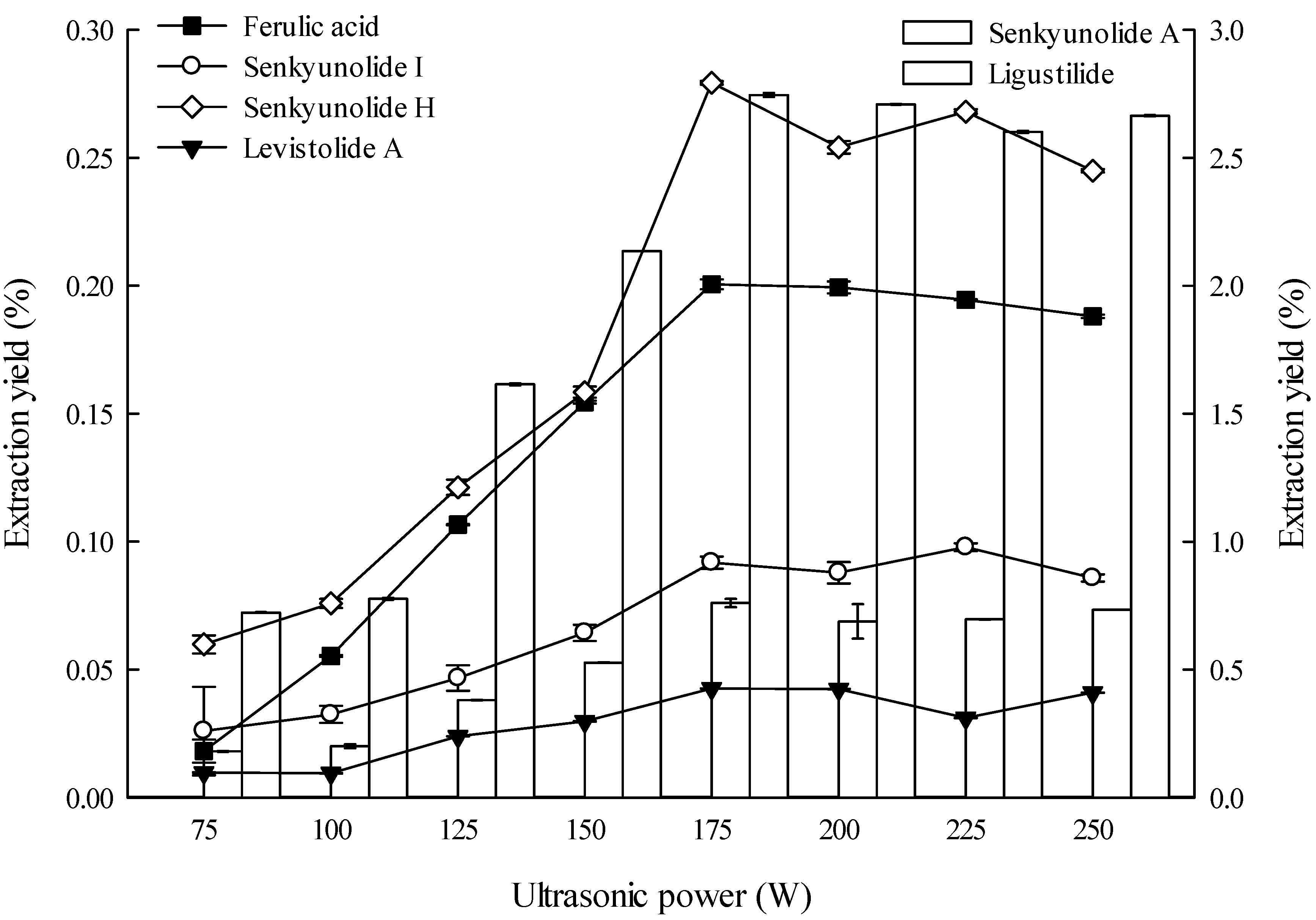 Effect of ultrasonic power on the extraction yields of the six constituents (the lines and bar graphs are referenced to the left and right axes, respectively).