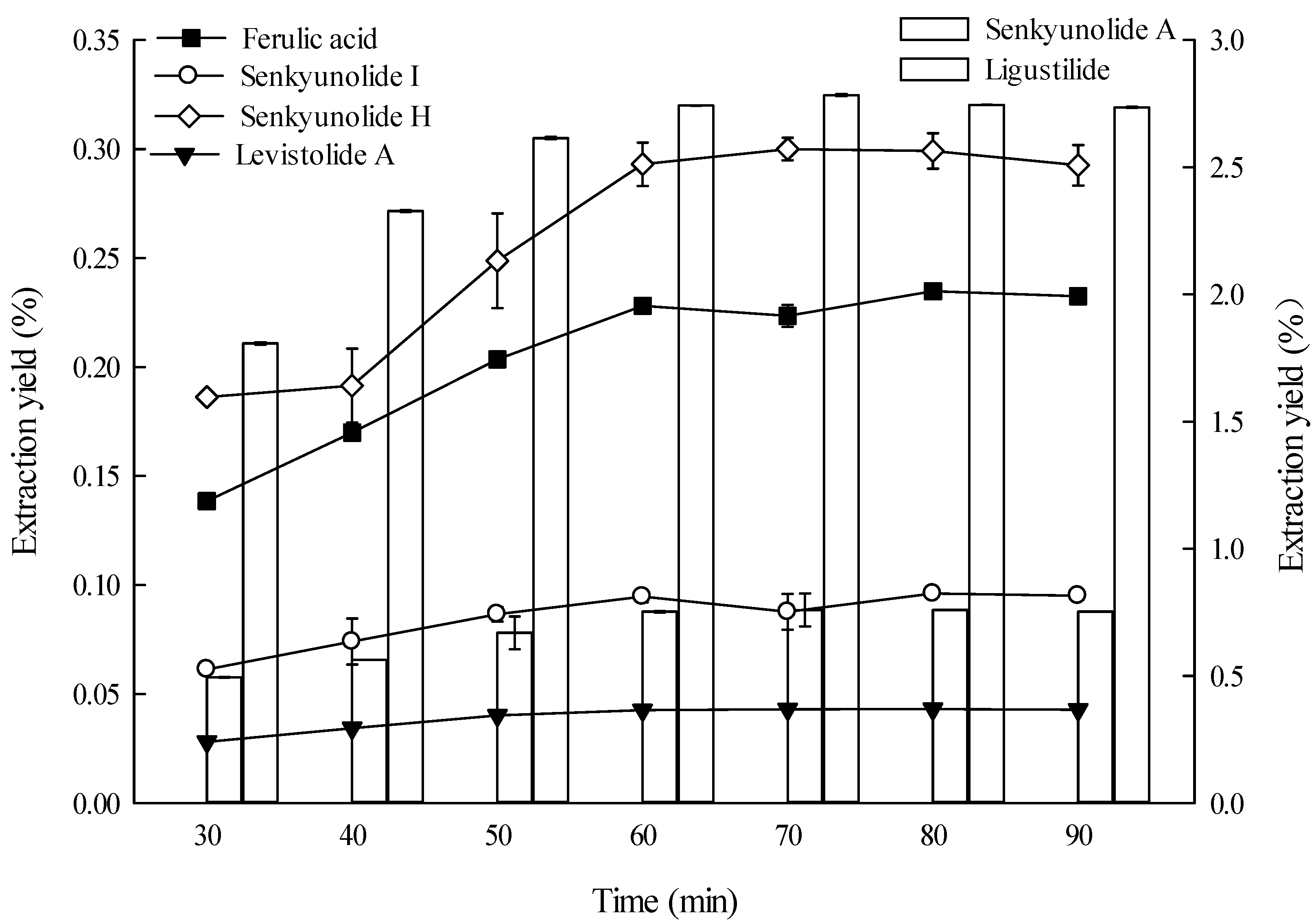 Extraction time, an important parameter in solvent extraction, has two phases, i.e., the dissolution of soluble components on the surfaces of the sample particle and the mass transfer of the solute from the plant matrix into the solvent by diffusion and osmotic processes [24]. The longer the time, solvent and sample contact more fully, and this might accelerate the absorption of solvent, soften the plant tissues and weaken the cell wall integrity, as well as enhance ingredient solubility, thus larger amounts of substances would distribute to the solvent. However, too long a time may lead to lower process efficiency and wasted time. Therefore, the extraction time must be appropriate. The effects of extraction time on the extraction yields of six constituents from L. chuanxiong rhizome are shown in Figure 7. The extraction yields of ferulic acid, senkyunolide I and senkyunolide A increased as extraction time was prolonged from 30 min to 60 min and peaked at 60 min. However, the extraction yields of senkyunolide H, levistolide A, and ligustilide increased as the extraction time increased from 30 min to 70 min and peaked at 70 min.