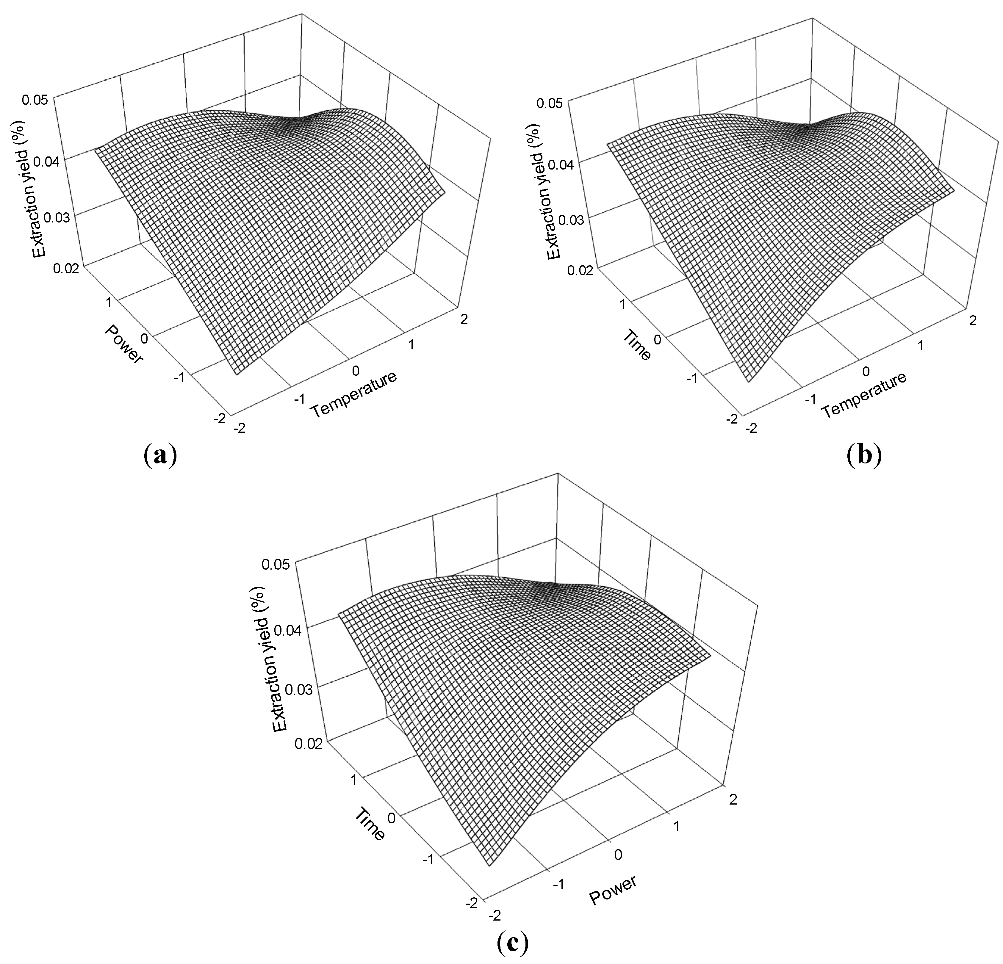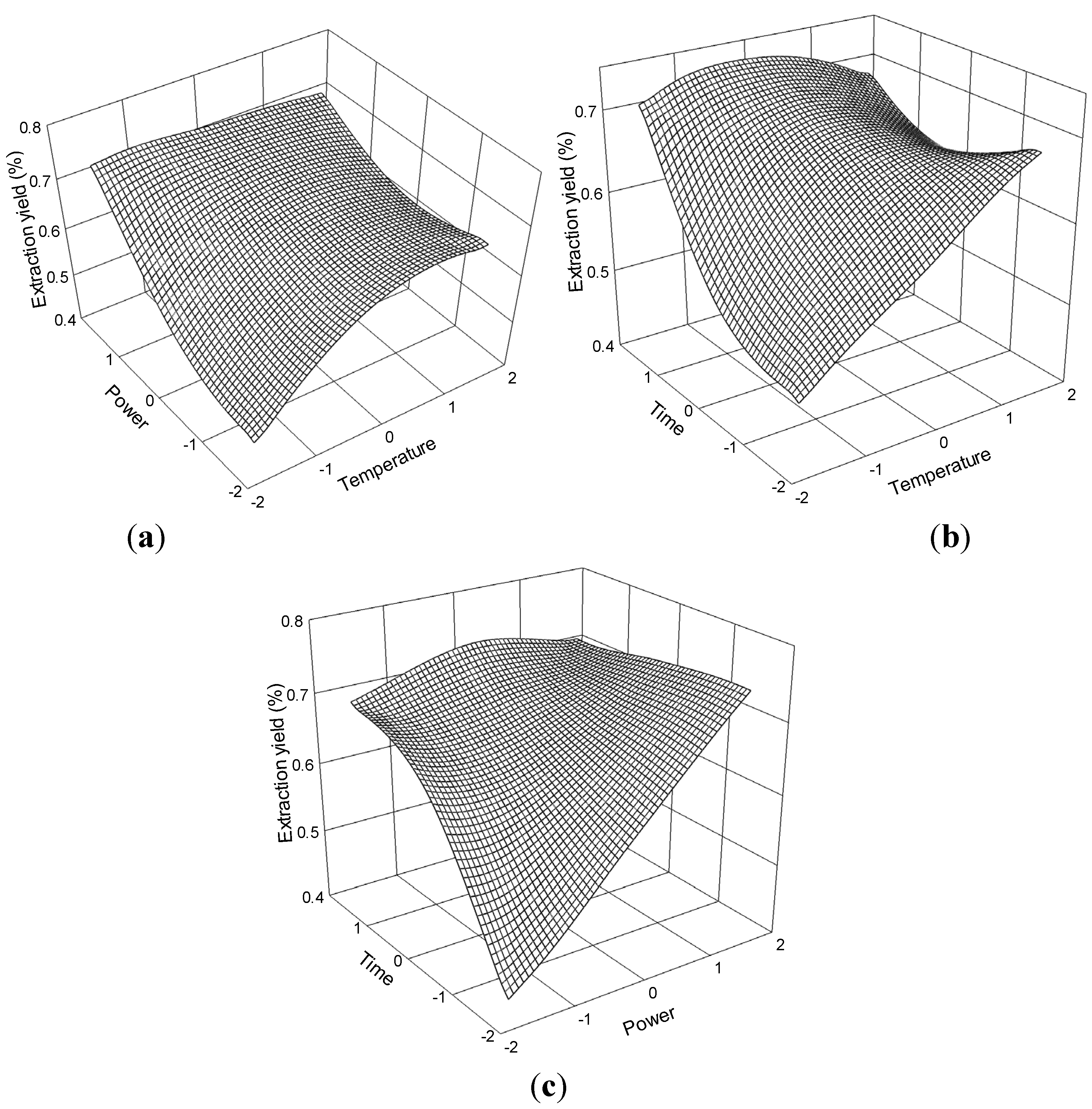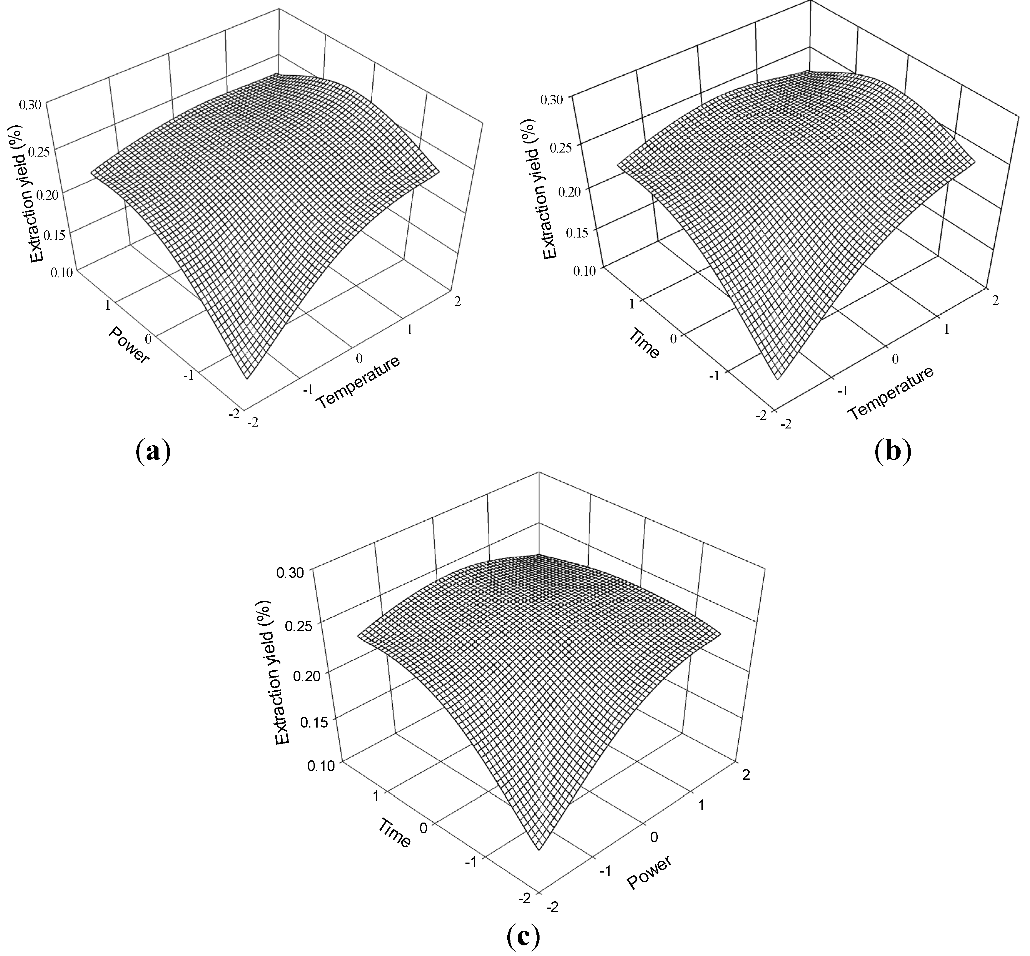 The single factor tests demonstrated the marked interaction among extraction temperature, ultrasonic power, and extraction time. Hence, RSM was used to investigate the influence of these three independent variables on the six extracts. The experiments were performed according to a rotatable central composite design (CCD) [46]. The coded values of the experimental factors and factor levels (Table 5) were used in the response surface analysis that was run 20× (Table 2) and performed in triplicate. The results of the response surface design were analyzed using Design Expert Software, version 8.0 (Stat-Ease, Inc., Minneapolis, MN, USA), and the contribution rate was calculated using the following equation: