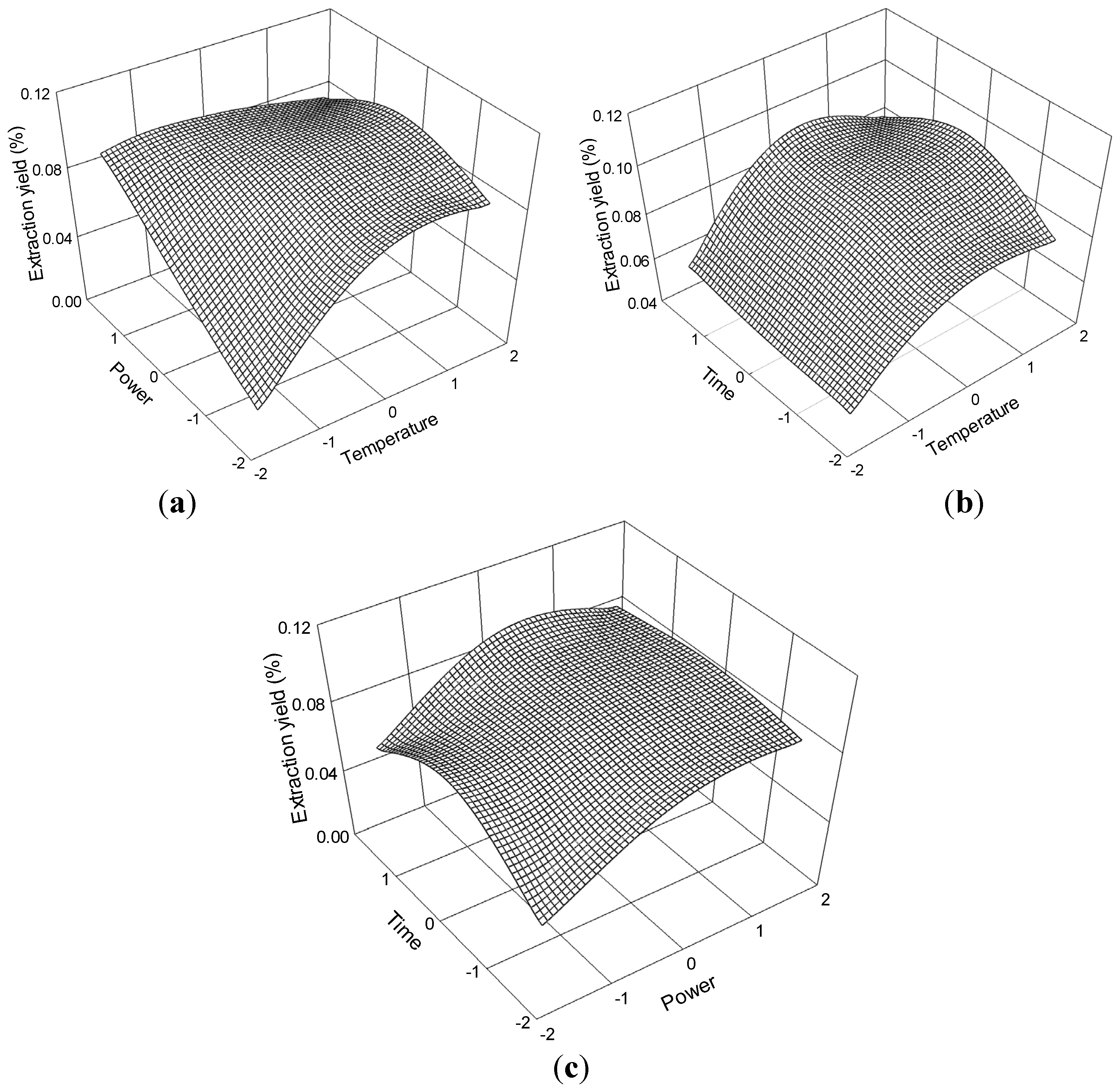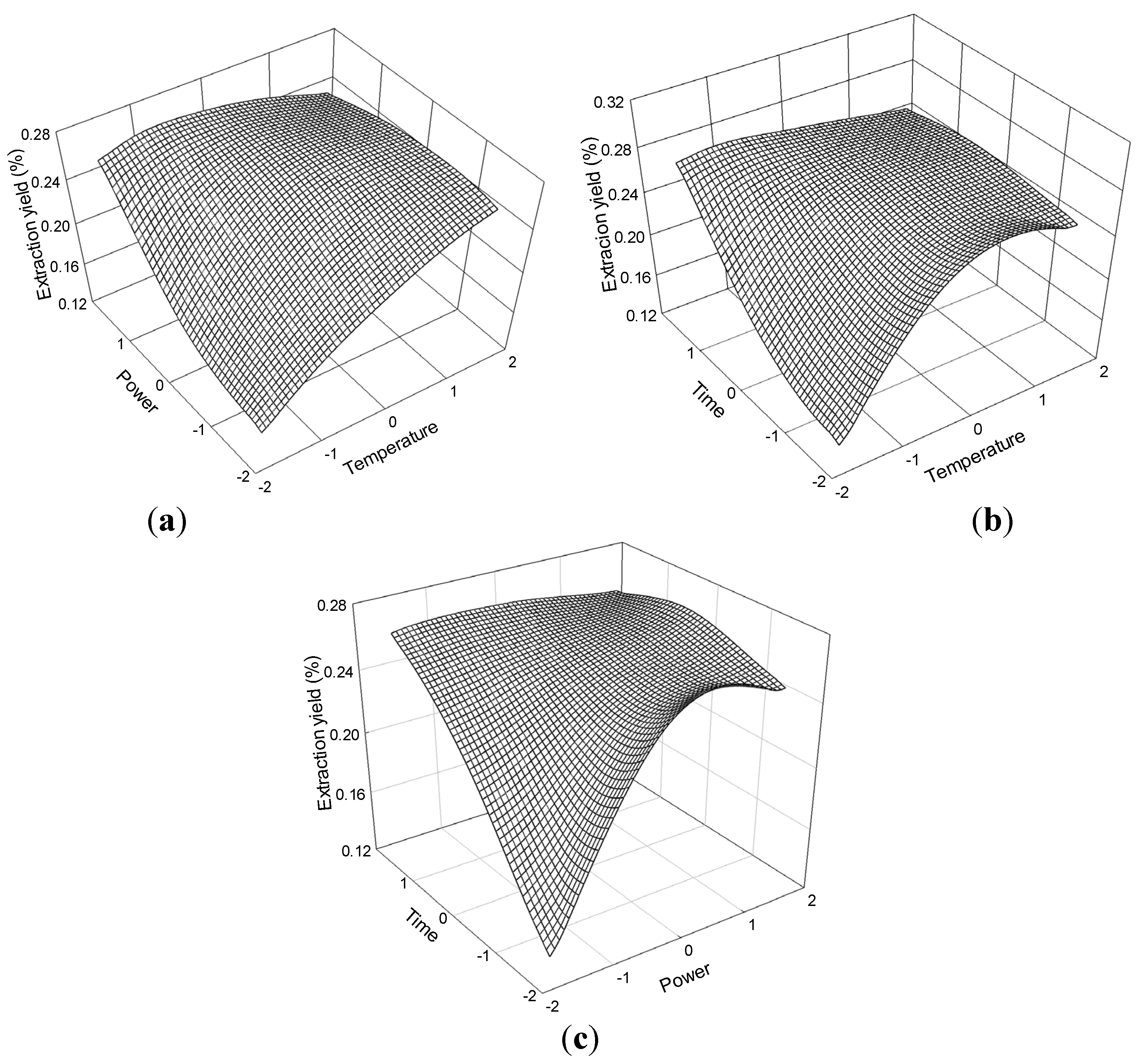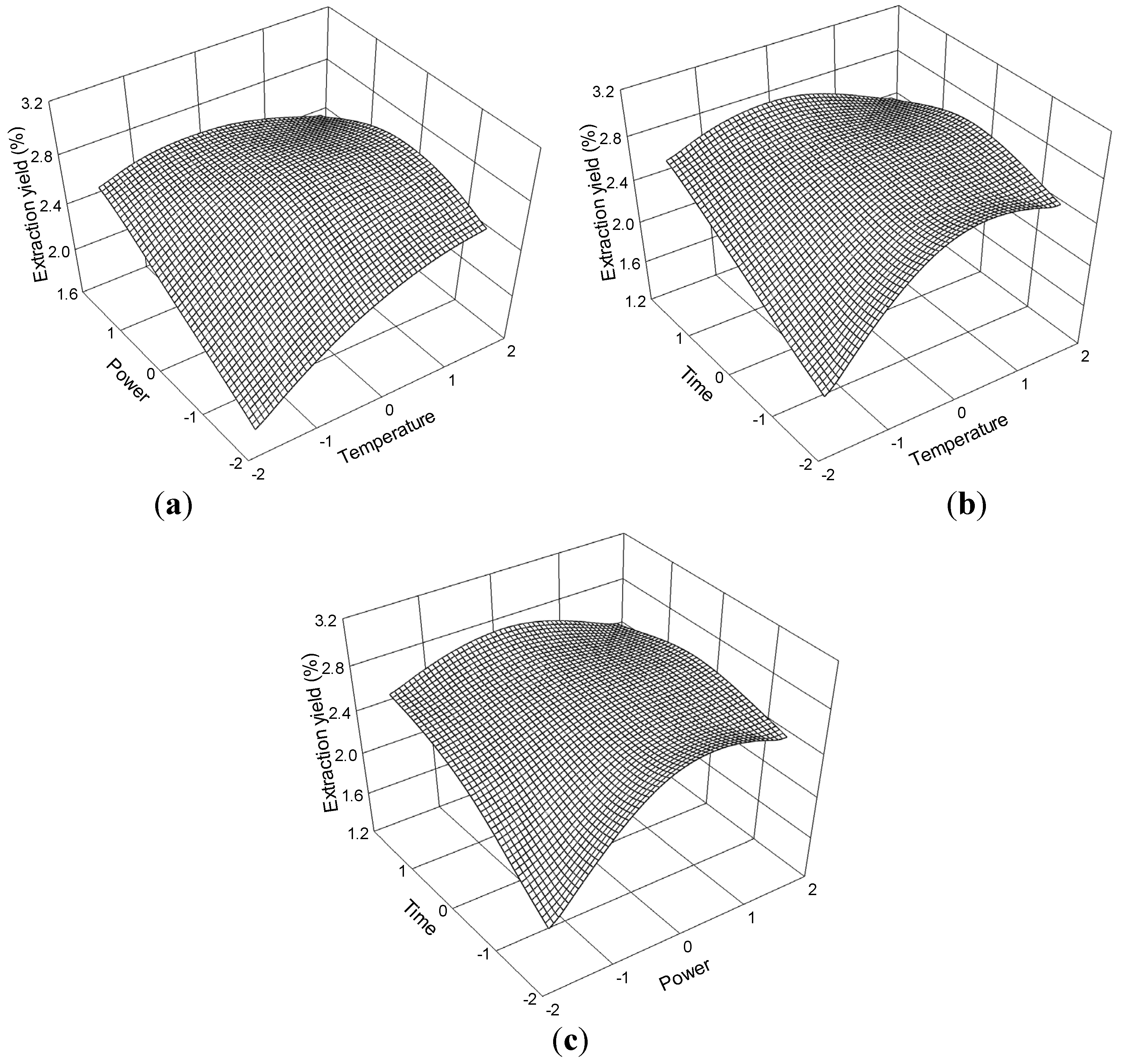 The single factor tests demonstrated the marked interaction among extraction temperature, ultrasonic power, and extraction time. Hence, RSM was used to investigate the influence of these three independent variables on the six extracts. The experiments were performed according to a rotatable central composite design (CCD) [46]. The coded values of the experimental factors and factor levels (Table 5) were used in the response surface analysis that was run 20× (Table 2) and performed in triplicate. The results of the response surface design were analyzed using Design Expert Software, version 8.0 (Stat-Ease, Inc., Minneapolis, MN, USA), and the contribution rate was calculated using the following equation: